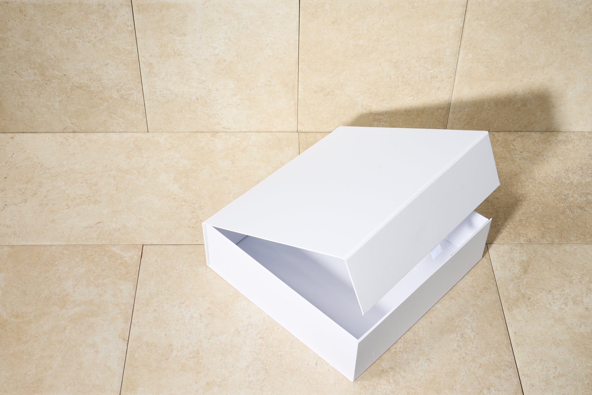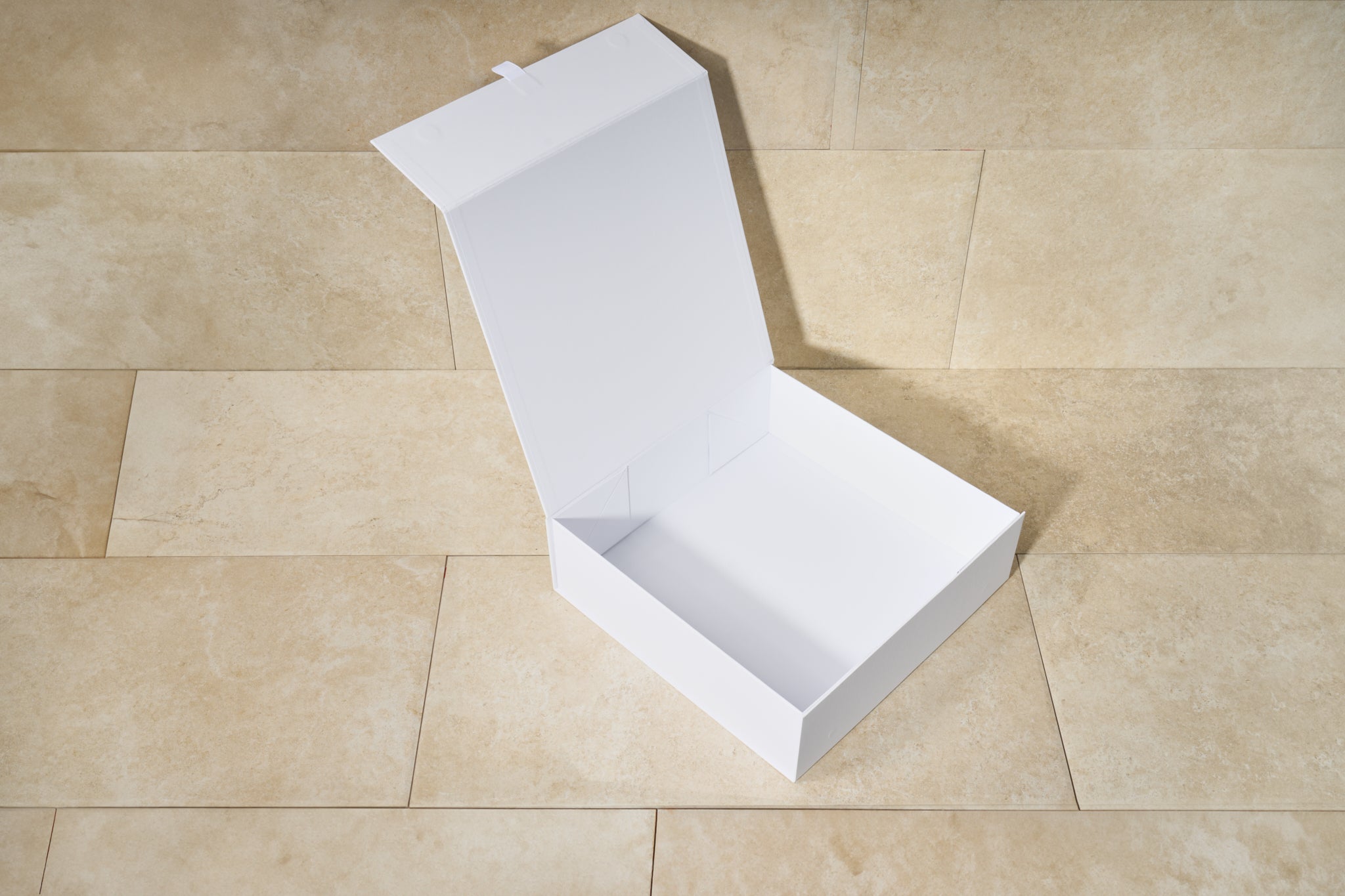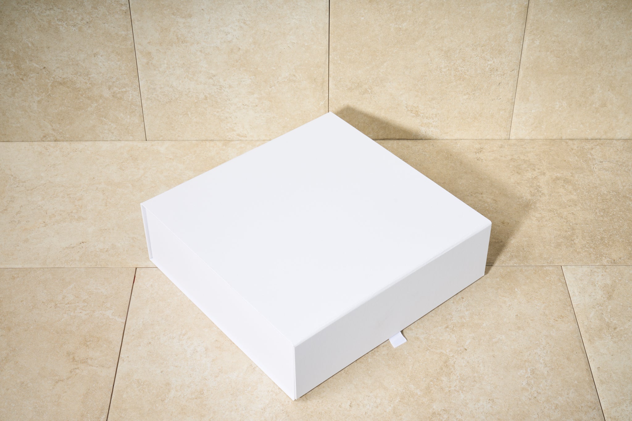 Premium Luxury Medium Gift Box to depth of 100mm, perfect for gift hampers that you wish to include a bottle of wine, champagne or spirit bottles, large candles, glassware, food products, clothing and lingerie with ribbon pull tab and magnetic closure. These Luxury boxes are supplied flat packed, and you remove the 3M adhesive strips to pop up and fold assemble then simply press firmly together. Our luxury silk touch covering material in black or white presents your quality products. Supplied in carton lots of 10 units, we do not break cartons. All boxes feature our small trademarked logo under the base.