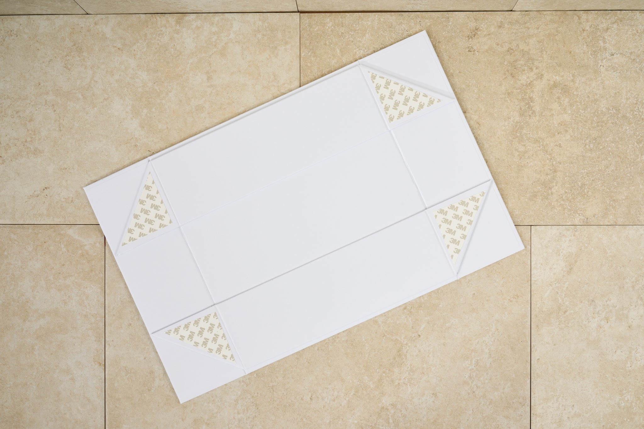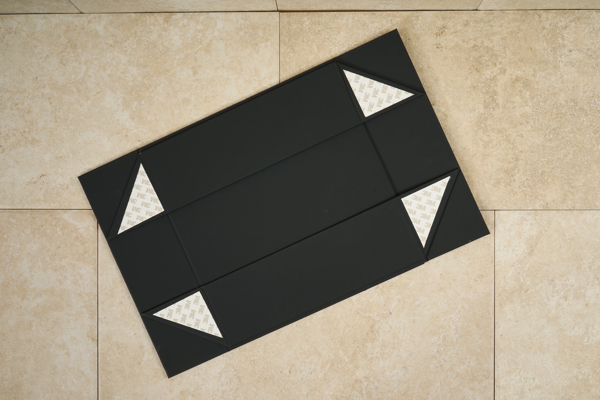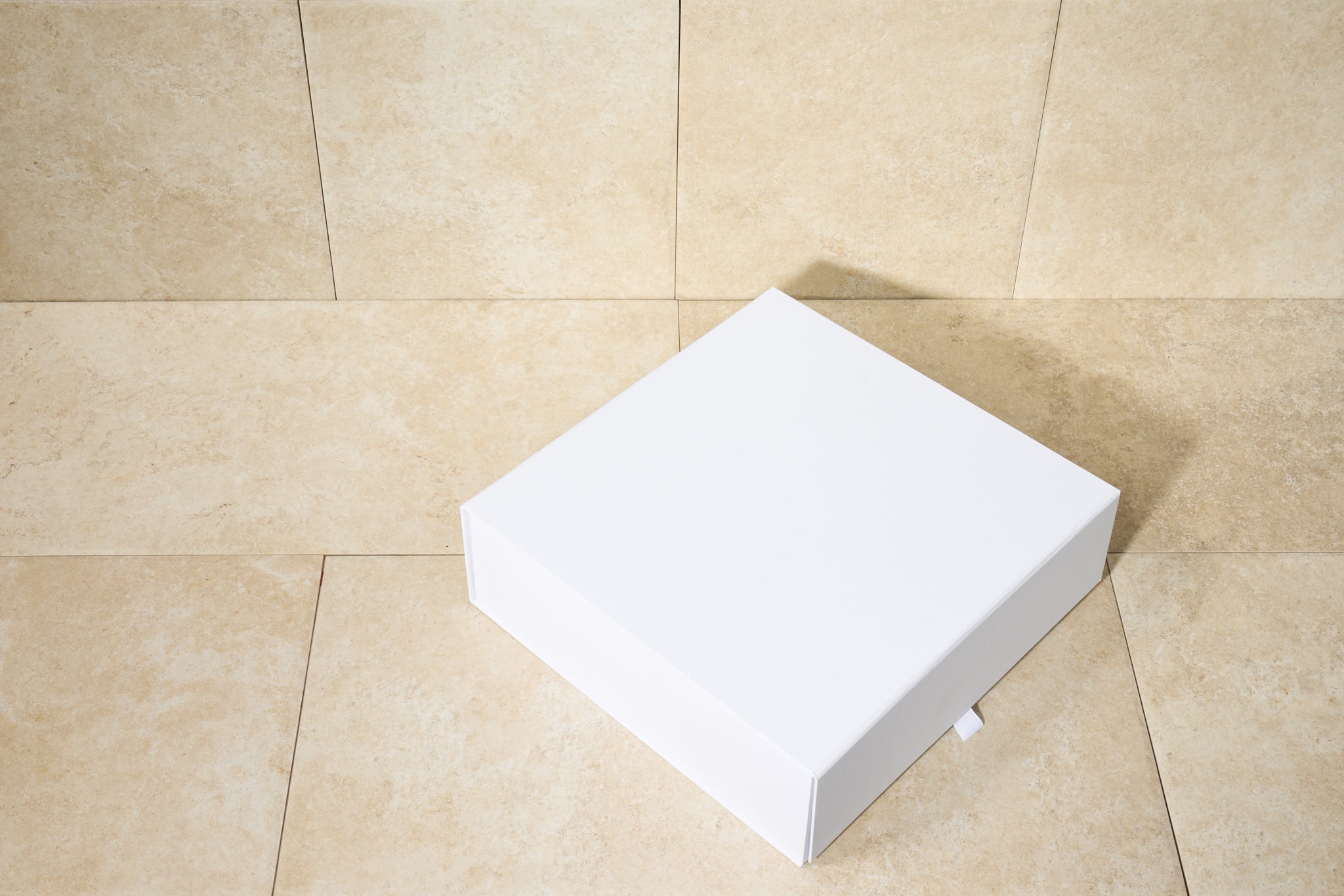 Premium Luxury Medium Gift Box to depth of 100mm, perfect for gift hampers that you wish to include a bottle of wine, champagne or spirit bottles, large candles, glassware, food products, clothing and lingerie with ribbon pull tab and magnetic closure. These Luxury boxes are supplied flat packed, and you remove the 3M adhesive strips to pop up and fold assemble then simply press firmly together. Our luxury silk touch covering material in black or white presents your quality products. Supplied in carton lots of 10 units, we do not break cartons. All boxes feature our small trademarked logo under the base.